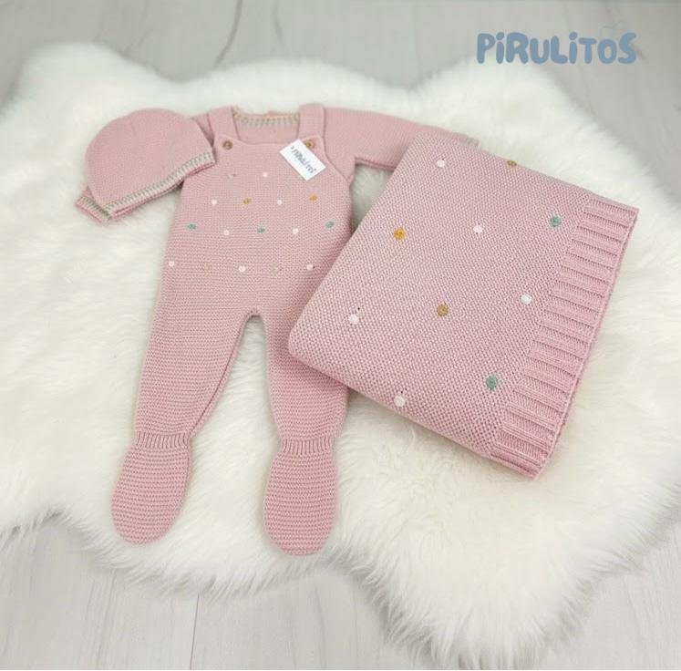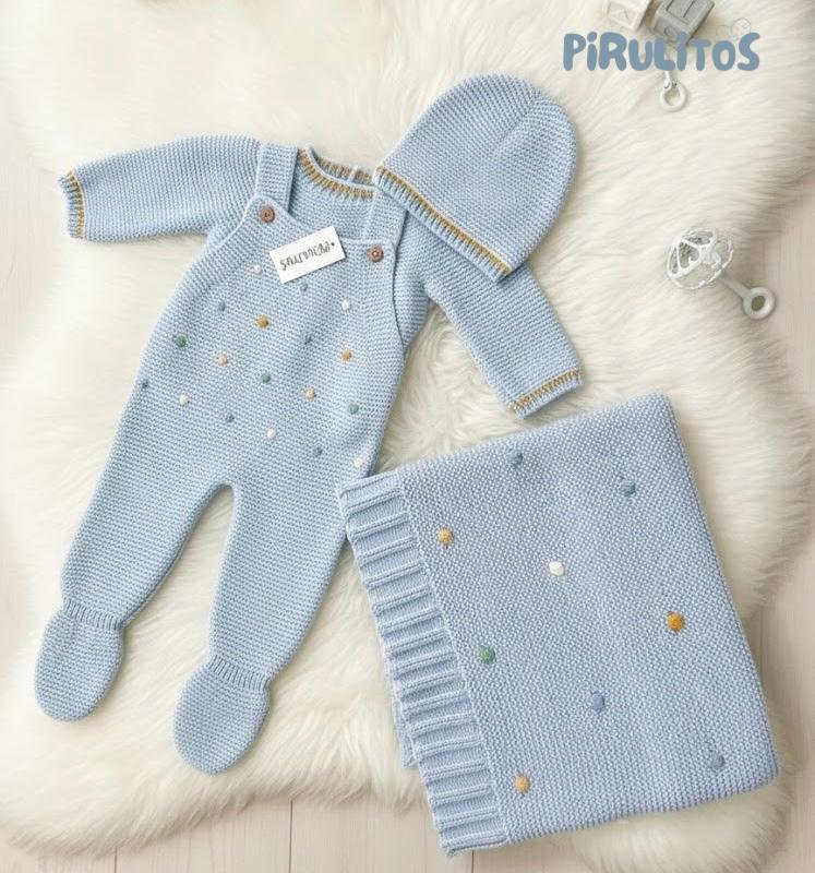 Conjunto compuesto por un mono, un jersey, un gorro y una colorida manta con pompones.
