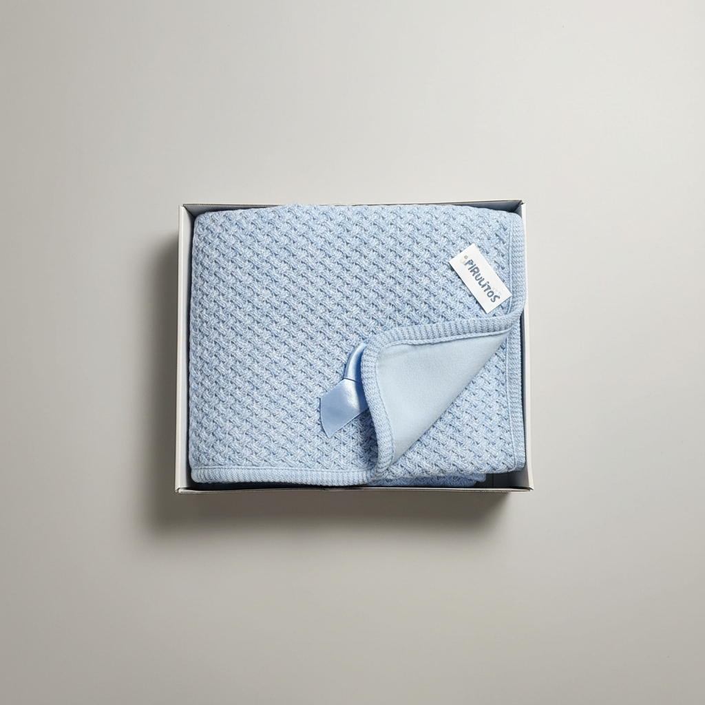 Manta de bebé em tecido de malha forrada.