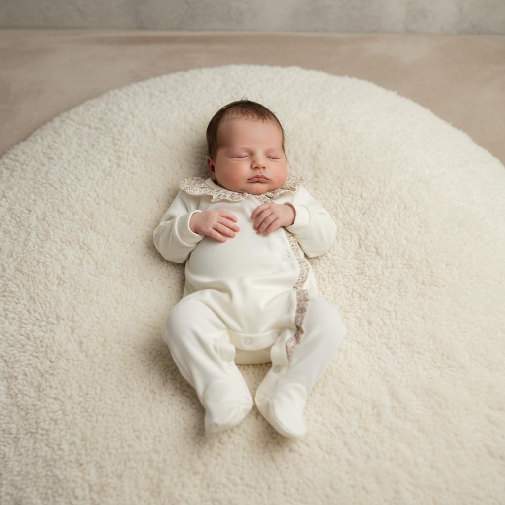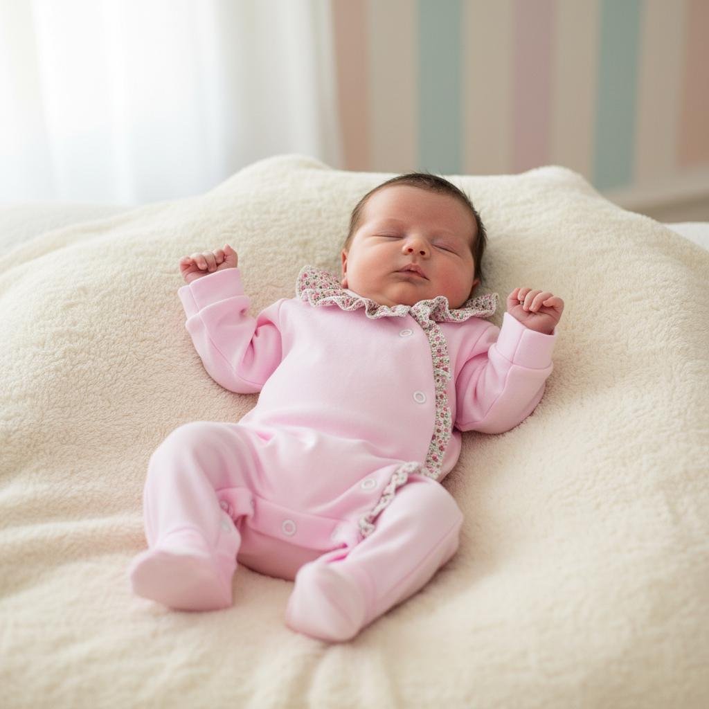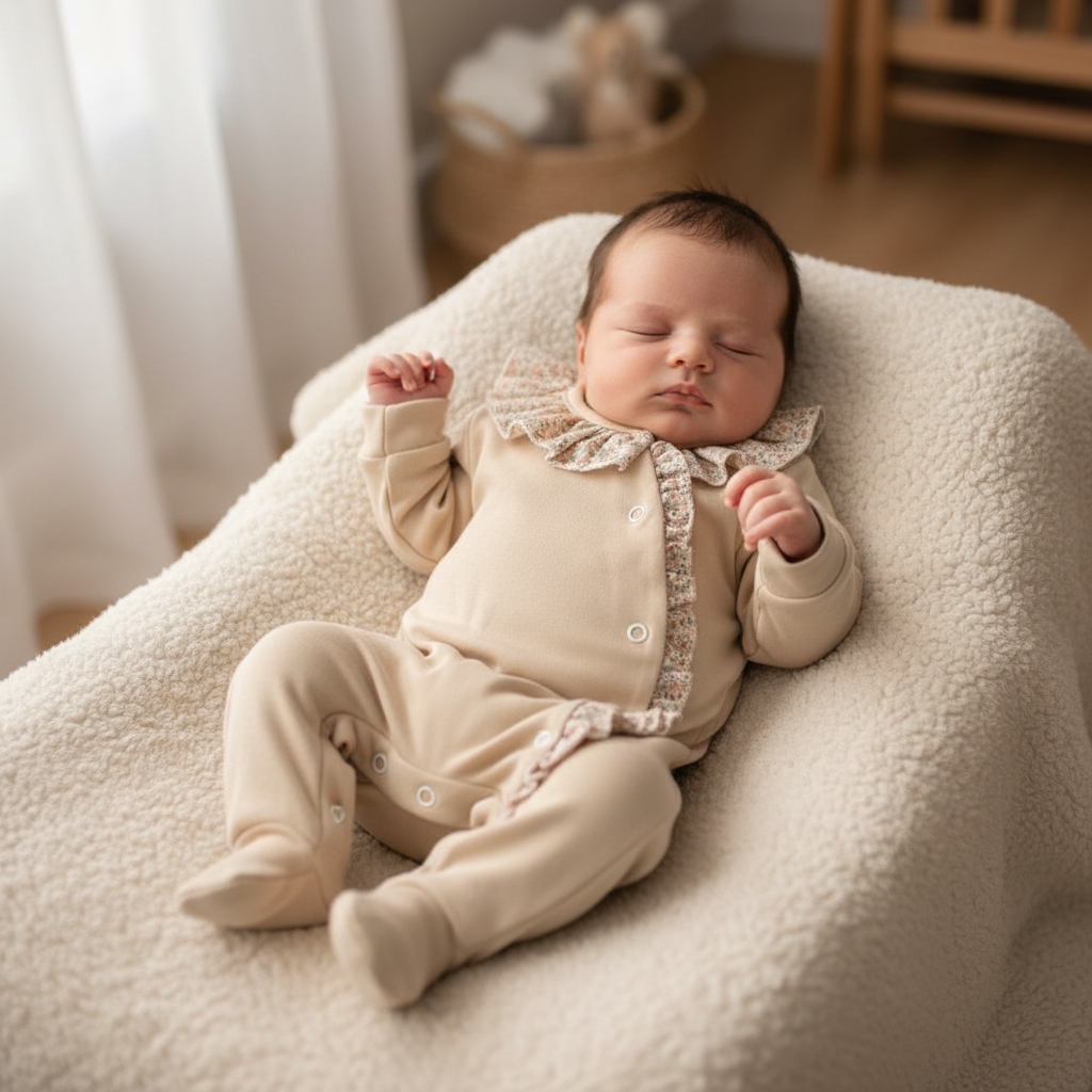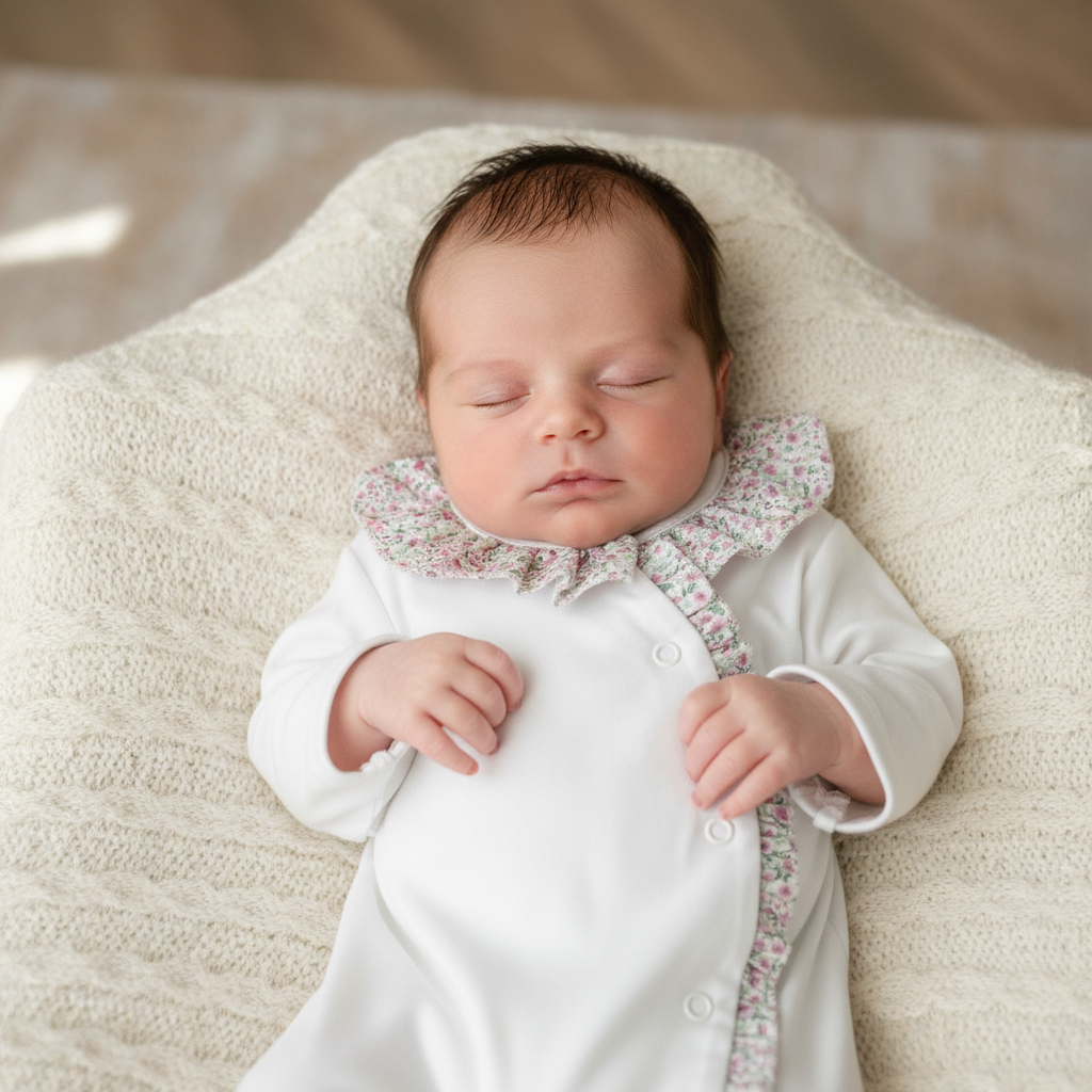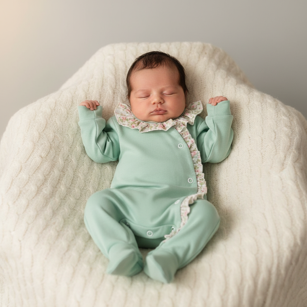 O design integra pés fechados para manter o bebé aconchegado e protegido, tornando-o perfeito para momentos de descanso ou passeio. Uma peça essencial no enxoval, que combina conforto, funcionalidade e um estilo delicado.