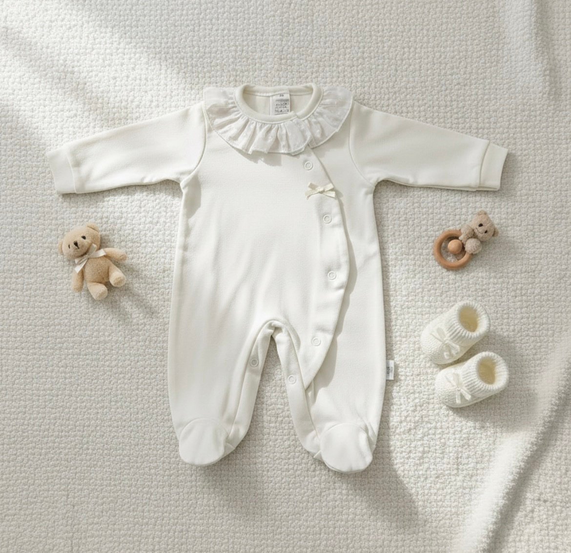 Babygrow em algodão macio, de trespasse, com gola de folho e delicados pontinhos.