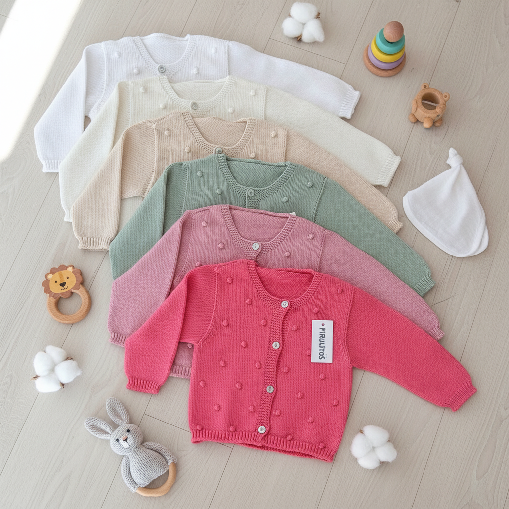 Casaco básico de malha para bebé com pompons.