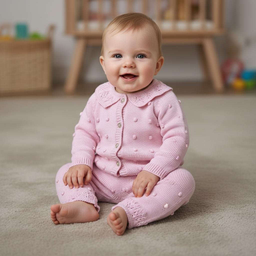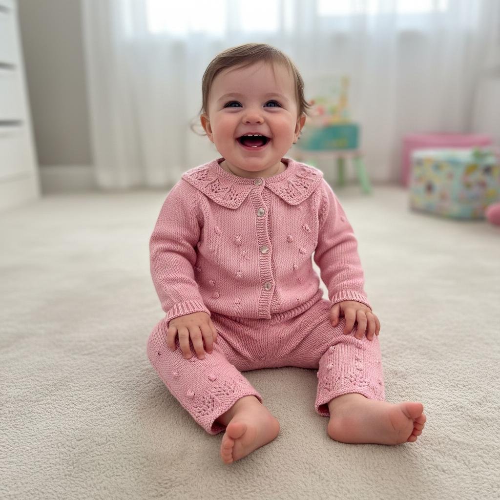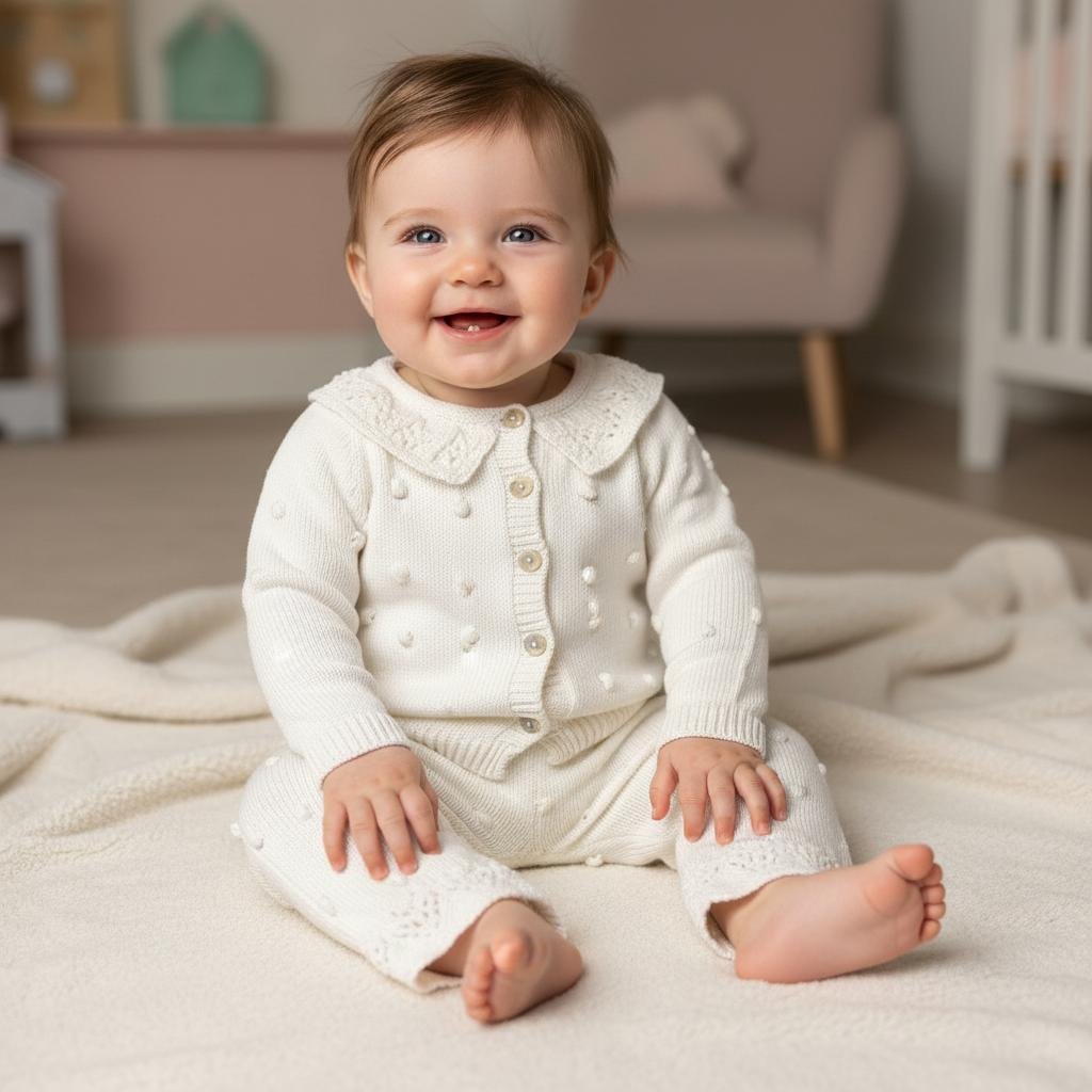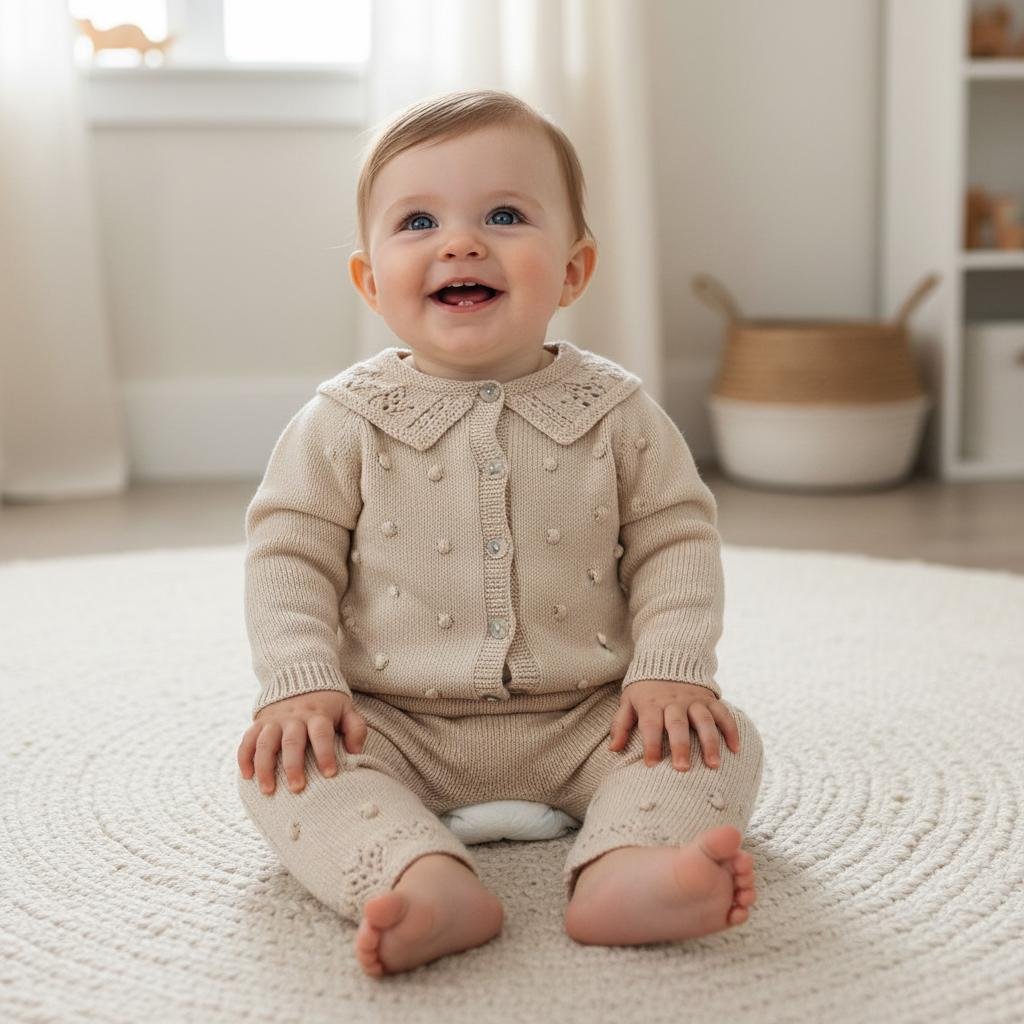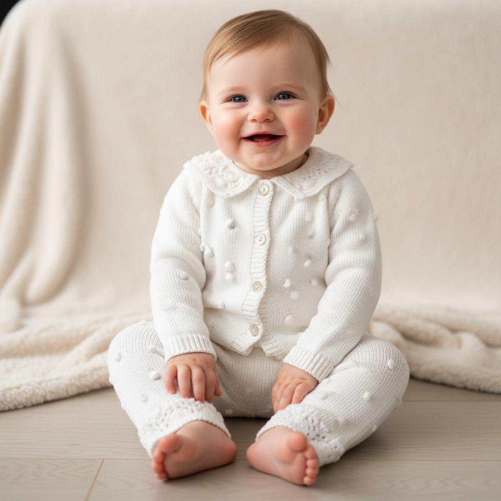 Conjunto de malha para bebé com pompons na frente, pensado para envolver os mais pequenos em conforto e elegância. O casaco apresenta uma delicada gola trabalhada e subtis detalhes em relevo que acrescentam textura e charme à peça, sendo complementado por botões frontais que facilitam o vestir. As calças, no mesmo padrão e tonalidade com trabalhado no fundo, completam o conjunto com harmonia e suavidade. Confeccionado em malha macia e aconchegante, este conjunto combina qualidade, delicadeza e um estilo intemporal, ideal tanto para momentos especiais como para o dia a dia do bebé. ✨👶🧶