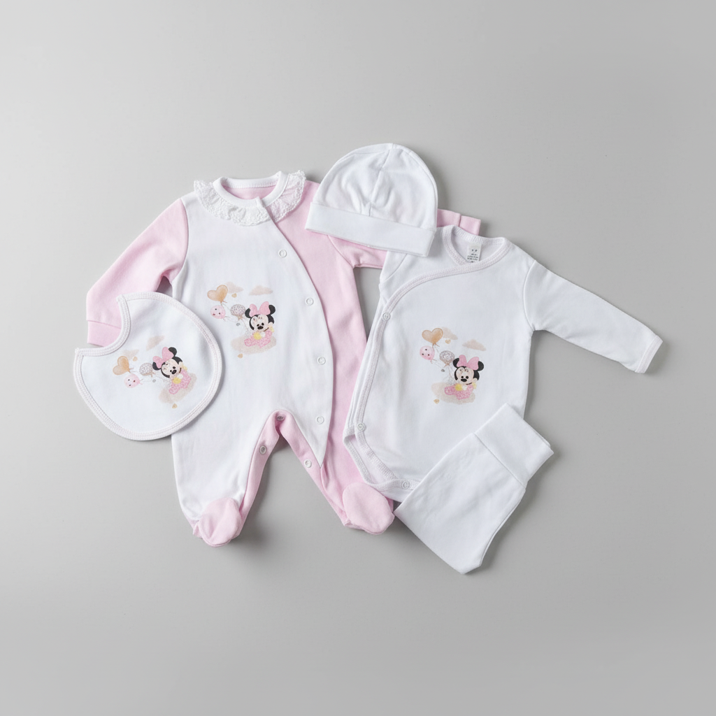 Conjunto de bebé primeira roupinha em algodão Mickey e Minnie com cinco peças: