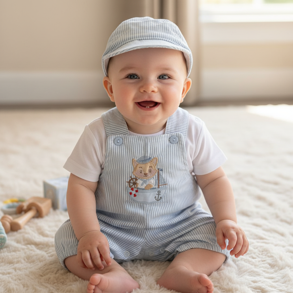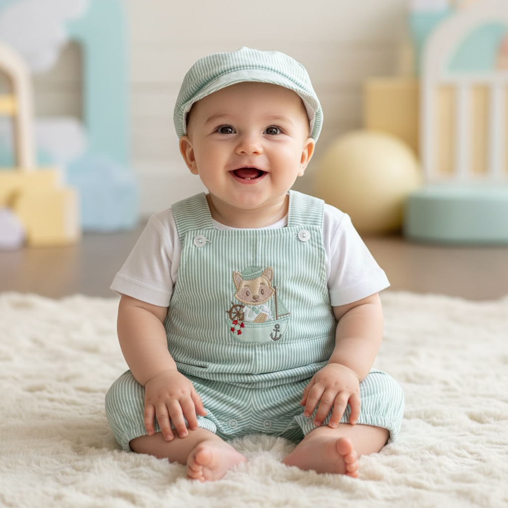 Conjunto de bebé composto por jardineira em tecido às riscas, com alças e botões frontais e um bordado delicado de um ursinho num barquinho na parte central. Inclui t-shirt branca de manga curta, simples e confortável, e boné a condizer com o mesmo padrão às riscas, criando um conjunto harmonioso e prático.✨