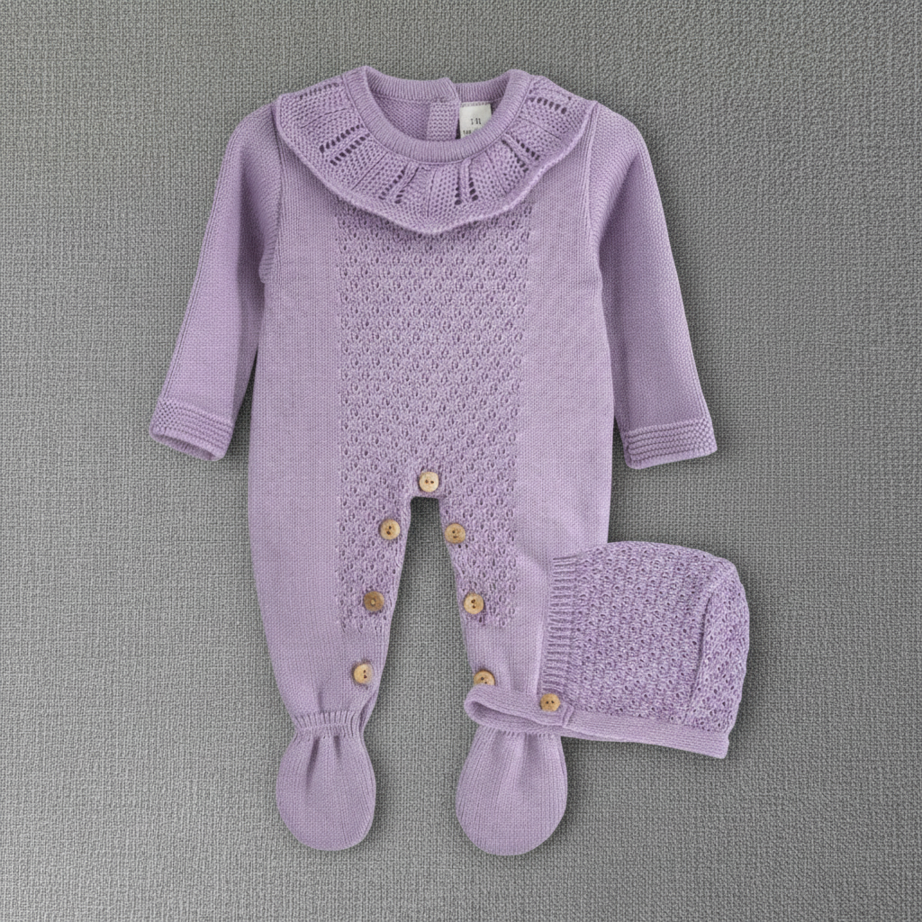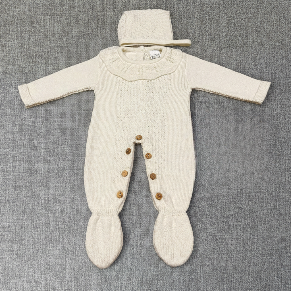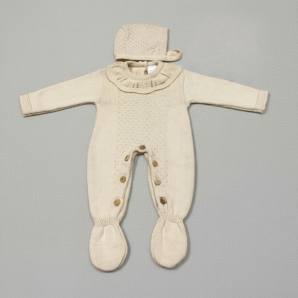 Macacão Bebé em Malha Com Gola Trabalhada e Touquinha