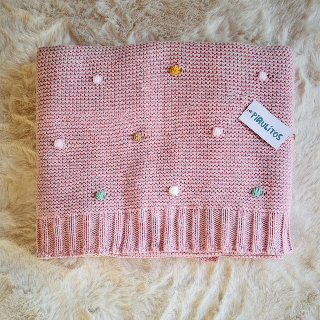 Manta de bebé em tecido de malha com pompons coloridos.