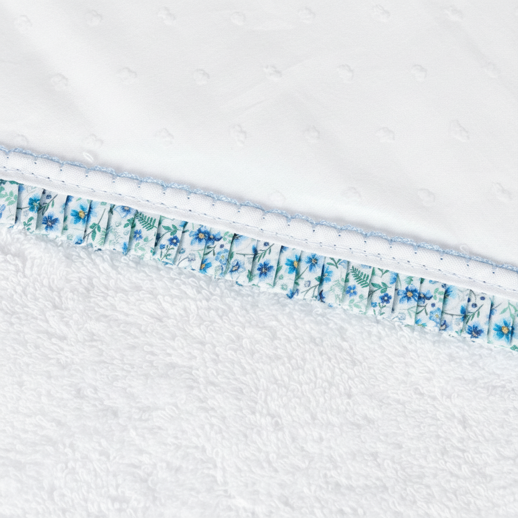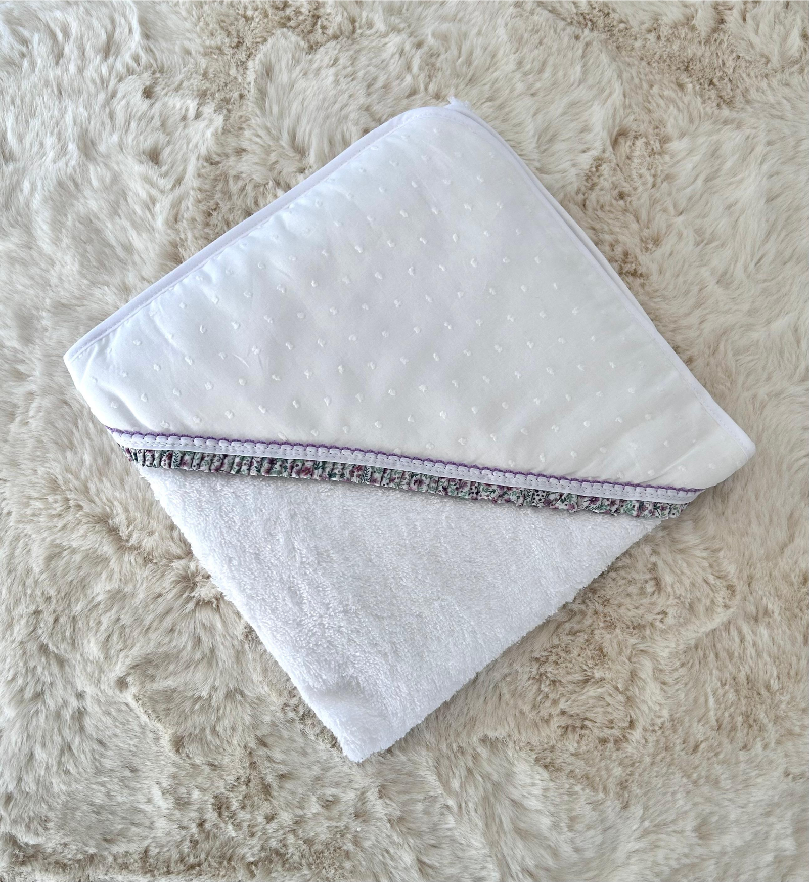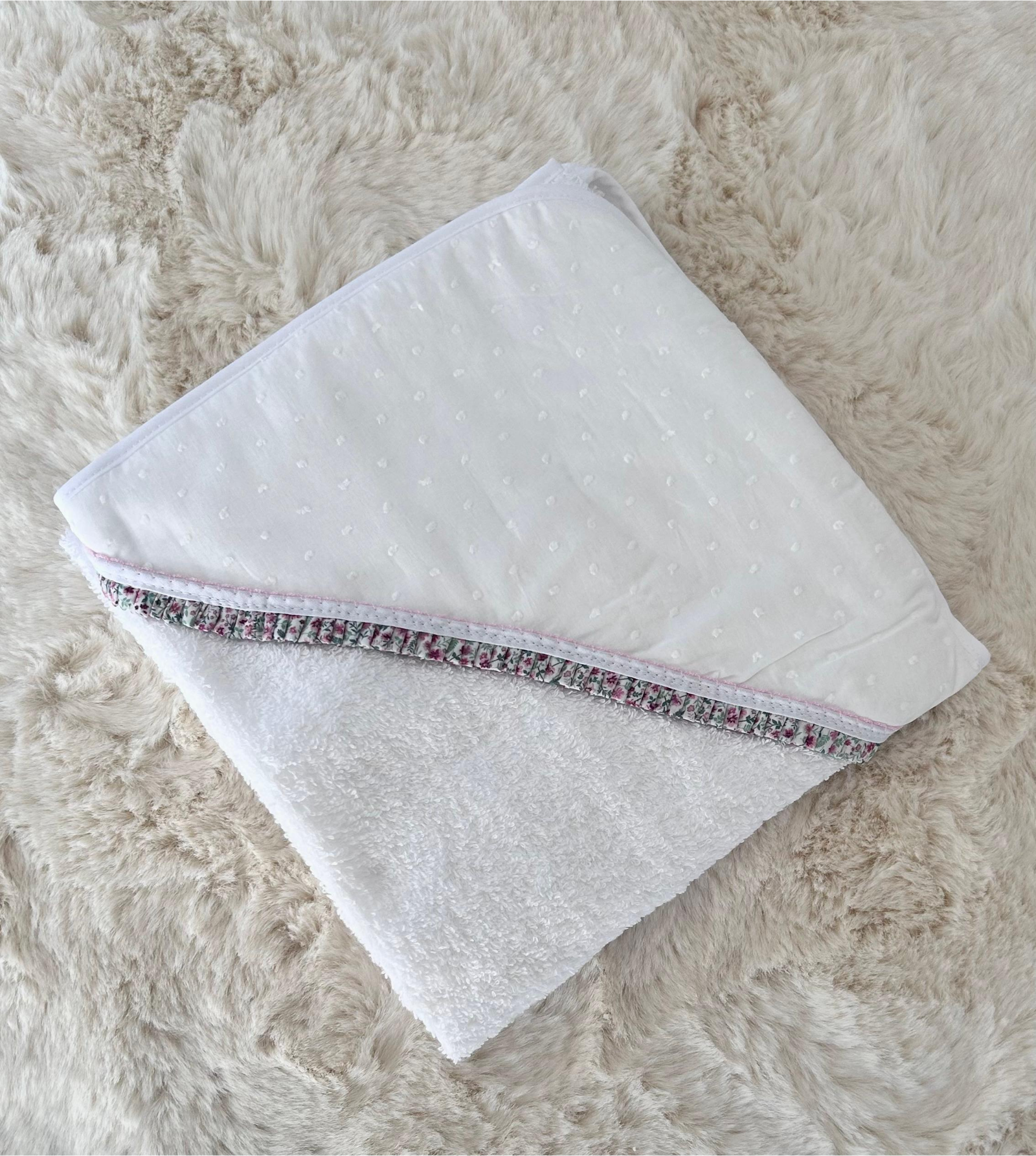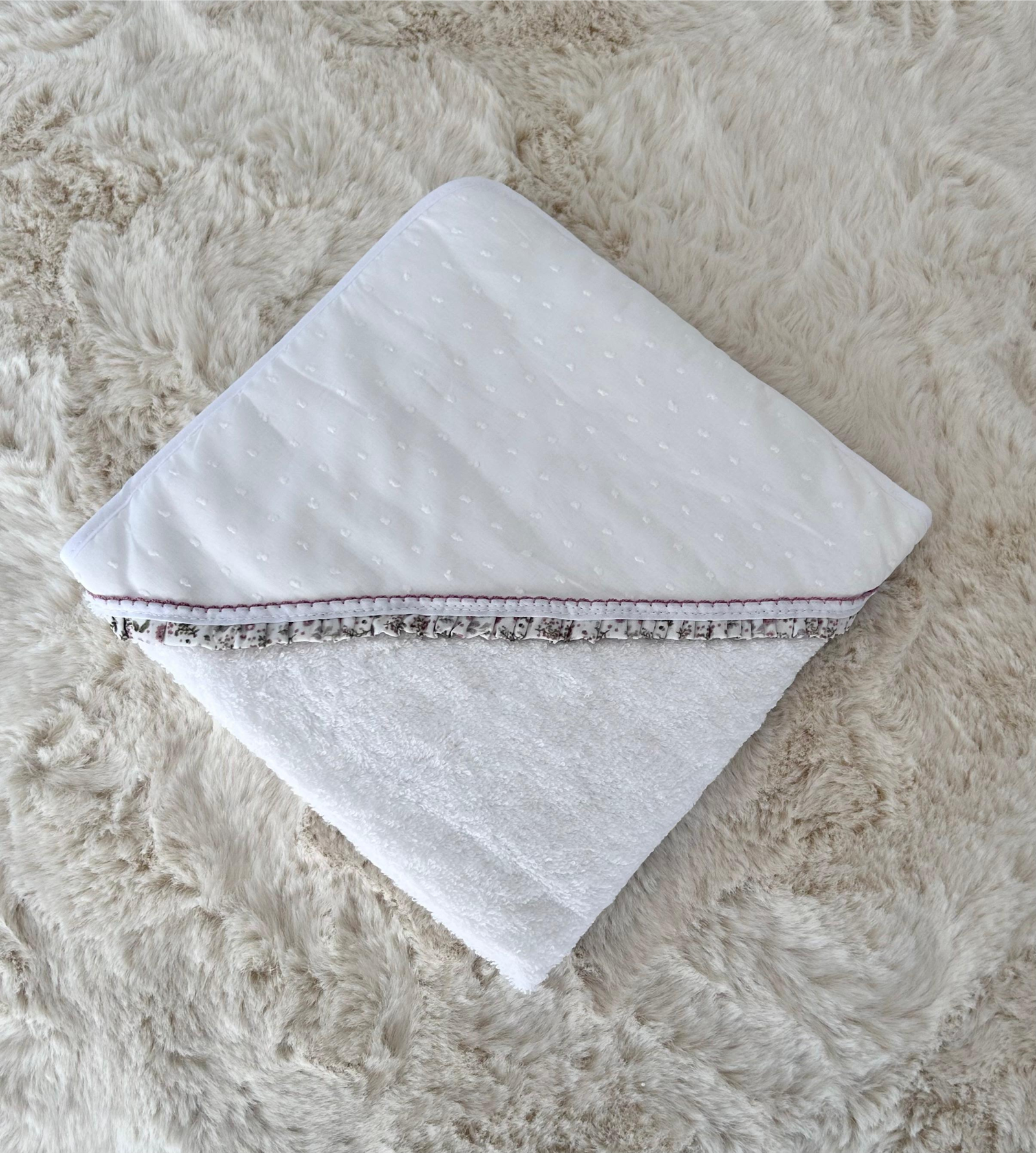 Toalha de banho bebé em algodão plumetis e tirinha com flores.