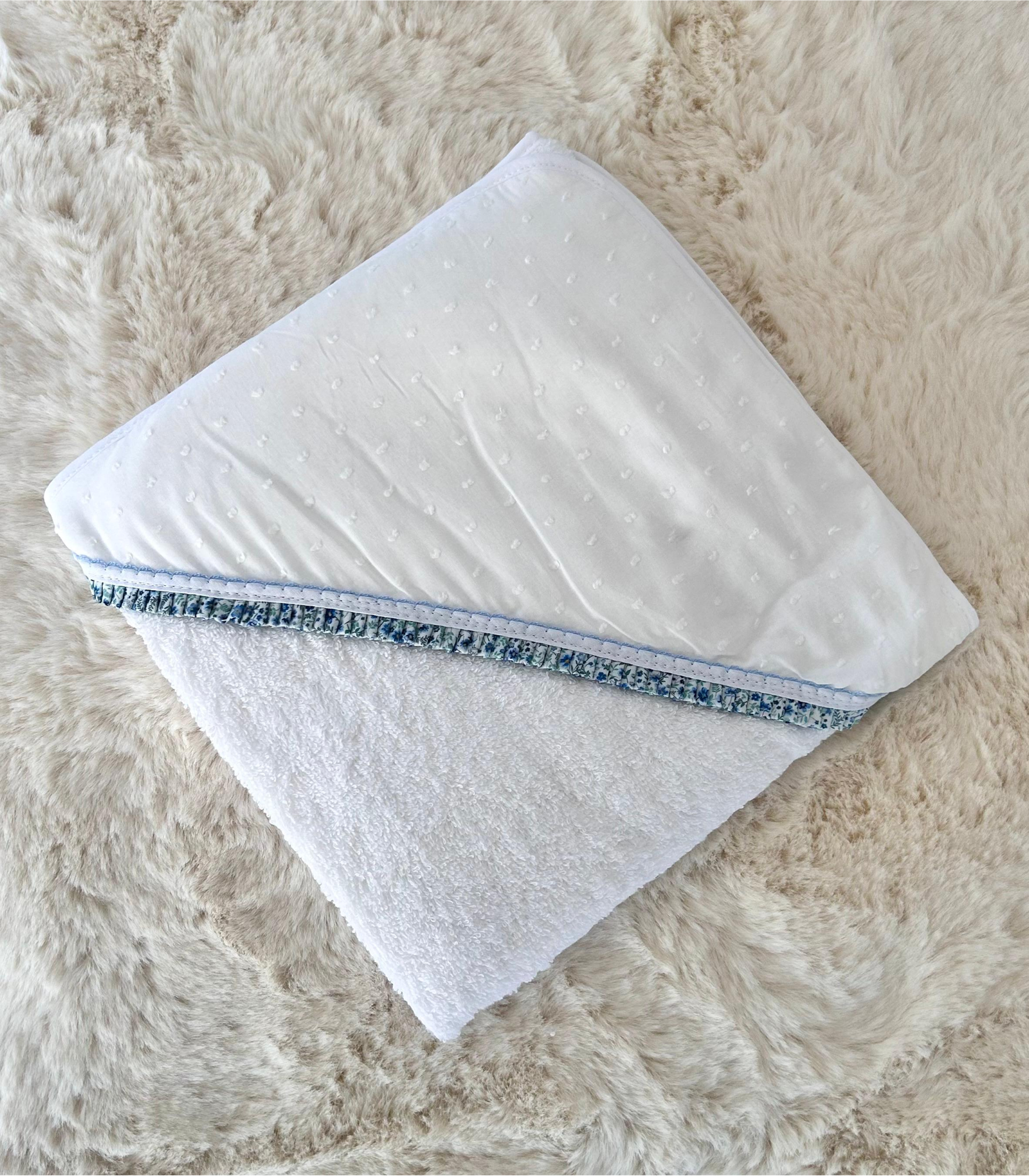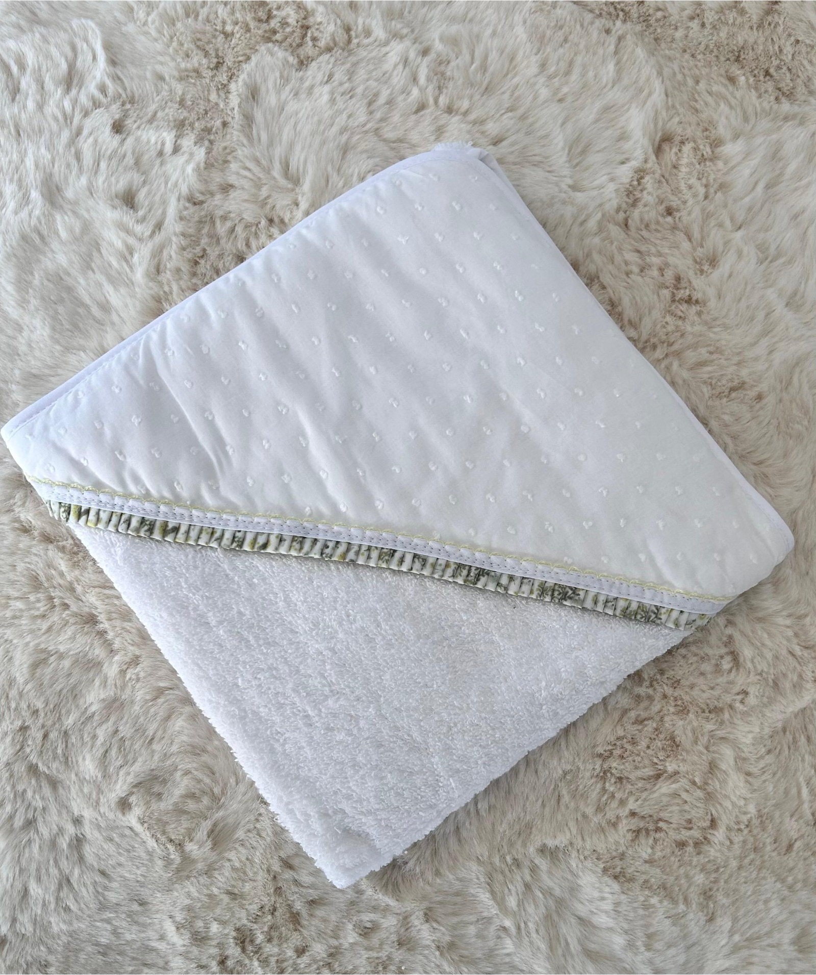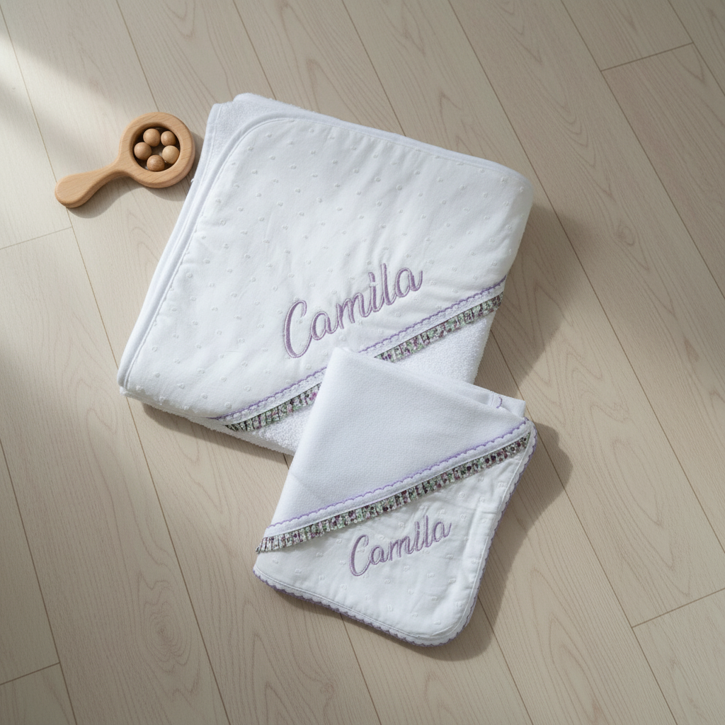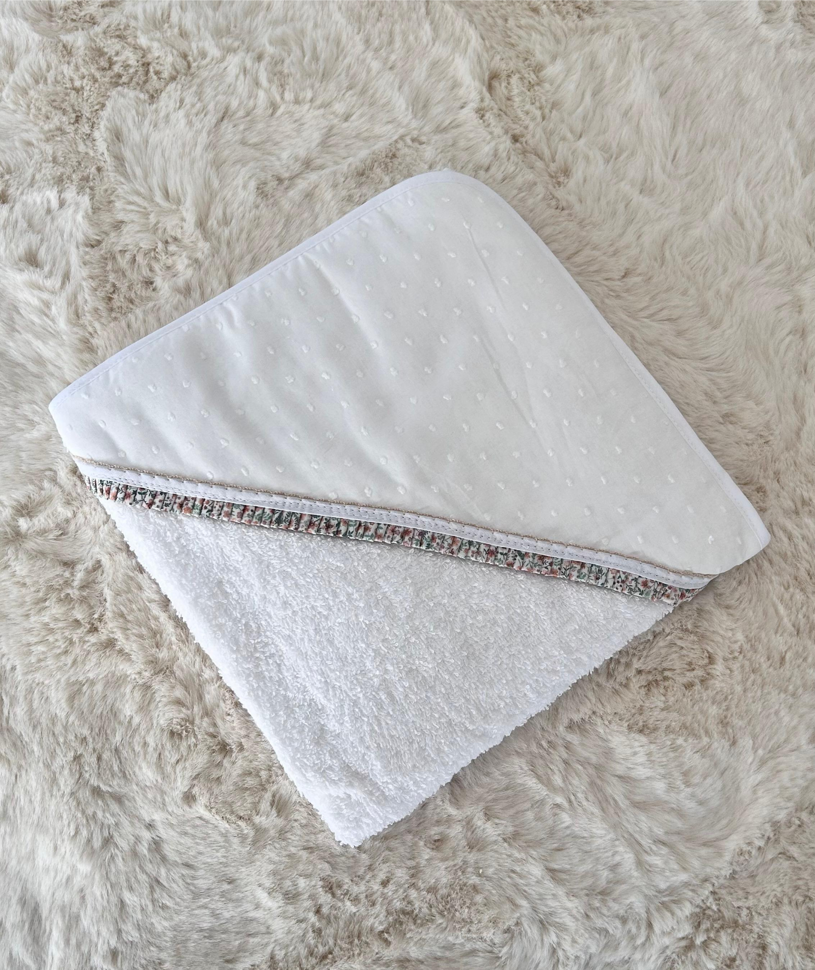 Toalha de banho bebé em algodão plumetis e tirinha com flores.